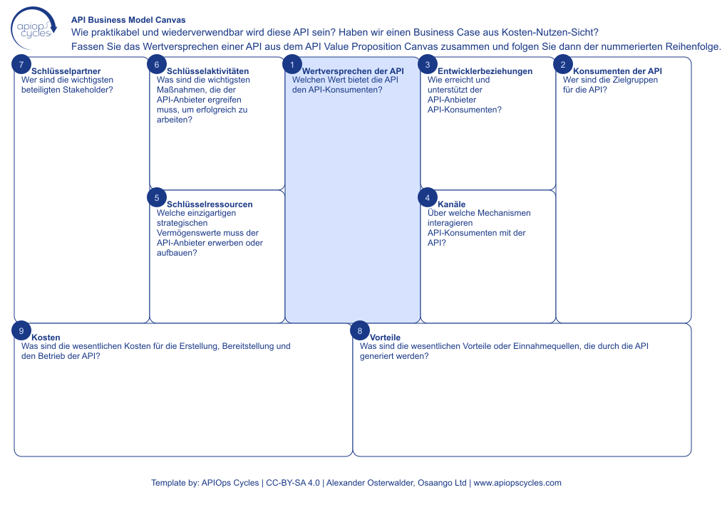 Strategische Bewertung der API-Geschäftsfähigkeit durch Zuordnung von Wertangeboten, Kundensegmenten und Schlüsselressourcen.